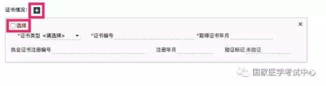 证书,这里添加的是已有医师资格证书的情况,助理升执业的考生,请务必填写,点击证书旁边的加号按钮,增加一个证书,将证书内容,将证书类型、资格证书号码、发证时间等信息填写完整,如果已经注册并持有执业证书的,执业证书信息也需要填写完整,全部填写完成后,勾选左上角的复选框,选择一个参加考试需要使用的证书。如果没有证书,点击下一步跳过即可。