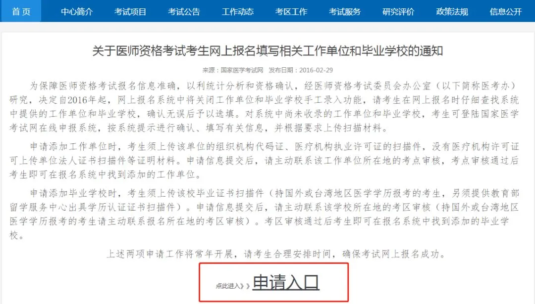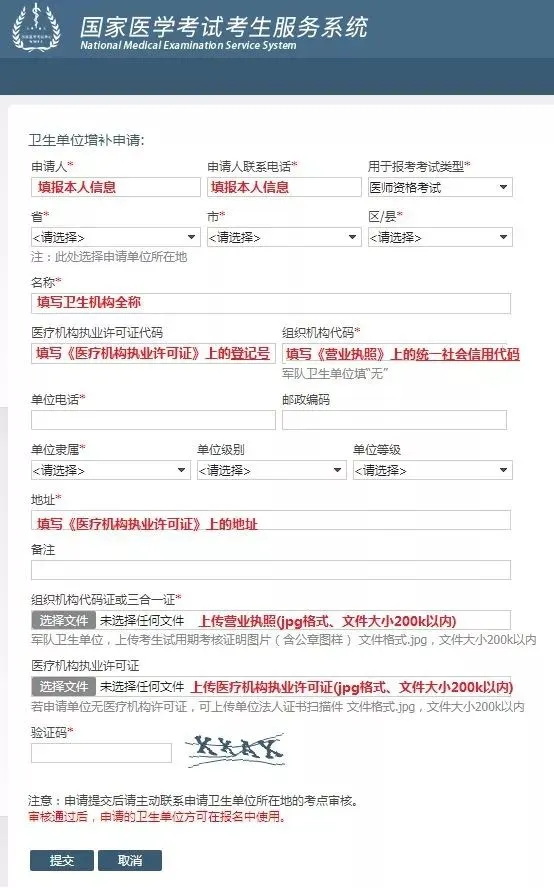 考生可以在网站上进行添加,申请添加工作单位时,考生须上传该单位的组织机构代码证、医疗机构执业许可证的扫描件,没有医疗机构许可证可上传单位法人证书等扫描件。