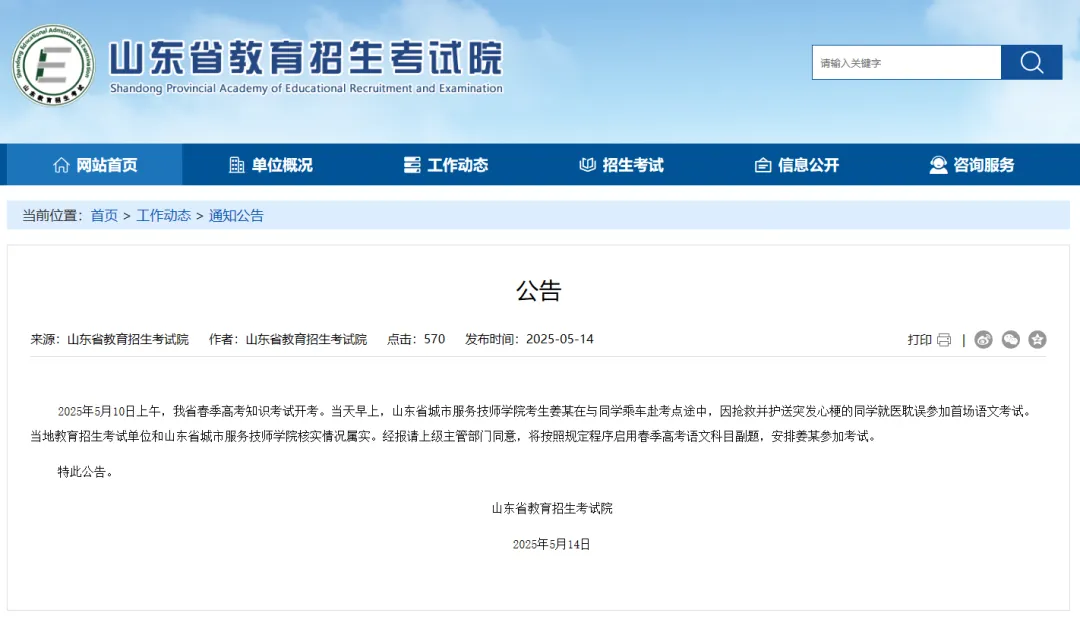2025年5月10日上午,我省春季高考知识考试开考。当天早上,山东省城市服务技师学院考生姜某在与同学乘车赴考点途中,因抢救并护送突发心梗的同学就医耽误参加首场语文考试。当地教育招生考试单位和山东省城市服务技师学院核实情况属实。经报请上级主管部门同意,将按照规定程序启用春季高考语文科目副题,安排姜某参加考试。