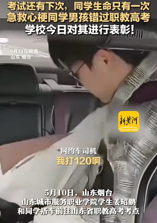5月10日早上,山东城市服务职业学院2022级学生姜昭鹏和同学8点10分搭乘网约车前往考点,车上同学因突发心梗休克,姜昭鹏利用在学校专业课中学到的急救知识,上演了“教科书”式的生死救援。因为迟到时间过长,导致他10日上午语文考试未能参加。但是姜昭鹏并不后悔这次缺考,“考试一次没考还有下一次,但是同学的生命只有一次,错过了就不会再重来。”姜昭鹏说。