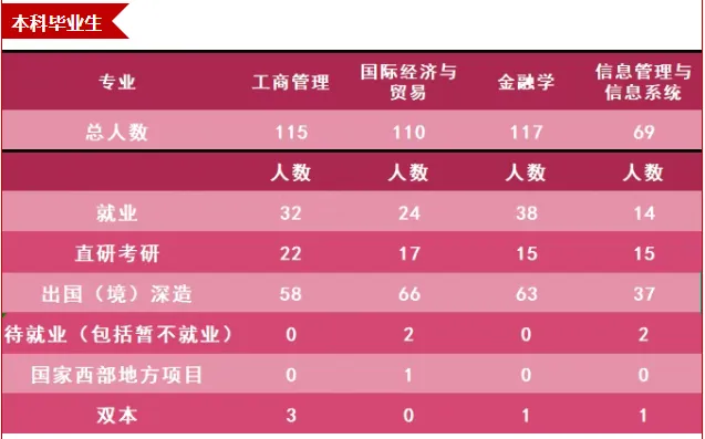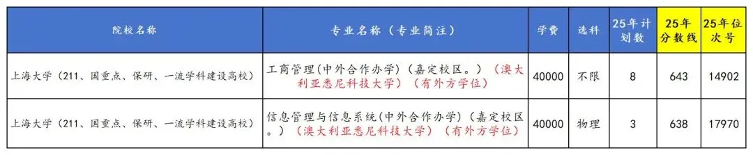 出国深造中,香港地区比较多,有77人,主要是香港大学、香港中文大学、香港科技大学。新加坡有16人,新加坡国立大学、南洋理工大学。澳大利亚40人,悉尼大学、墨尔本大学。英国50人,主要是伦敦国王学院、爱丁堡大学等:本科生进入国企有37人,民企32人,机关单位14人、三资企业20人。具体去向:有26人就业选择银行系统,15人选择会计事务所,14人进入互联网企业,14人进入党政机关事业单位。一共69人。占选择就业108人的63.88%。------------------------------------------------------------------------总体来说,上海大学悉尼工商学院还是不错的,特别是国内升学质量及外申情况都比较好。就业质量也可以。学费40000元每学年,也属于中等收费。地处上海,区域位置好。就是招录的2个专业稍微差一点。一个工商管理,一个信息管理与信息系统。工商管理25年643分,这个分数对于想出国深造的孩子来说,如果报考港中深的综合评价招生,被录取的话,感觉更有性价比。当然很难,除非英语能力、综合素质能力很强。信息管理与信息系统25年638分,上海大学悉尼工商学院开设的方向也还可以,现在信管专业都一点偏数字化方向。涉及机器学习、信息数字化分析。不过西财特拉华数据科学学院下的信管是偏金融数据分析方向,更加好一点。------------------------------------------------------------------------26年三位一体规划、高考志愿规划已经开启招生,现在报名定名额有优惠,有需要的家长可以扫码报名哦~~