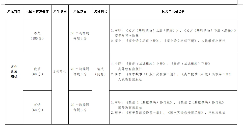 B类考生:综合成绩=文化素质测试成绩+职业技能测试成绩。