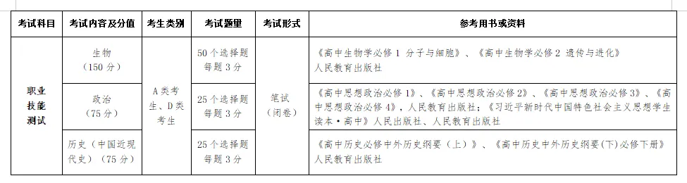 文化素质测试成绩以学生取得的高中学业水平合格性考试语文、数学、外语科目有效成绩代替(补考成绩不作为有效成绩),3门合计300分。职业技能测试由学校组织命题及考试,采取笔试闭卷方式,考试内容为生物、政治、历史(中国近现代史),试卷命题分值分别按2:1:1比例分布,合计300分,考试时间为90分钟,重点考察学生的职业适应性。