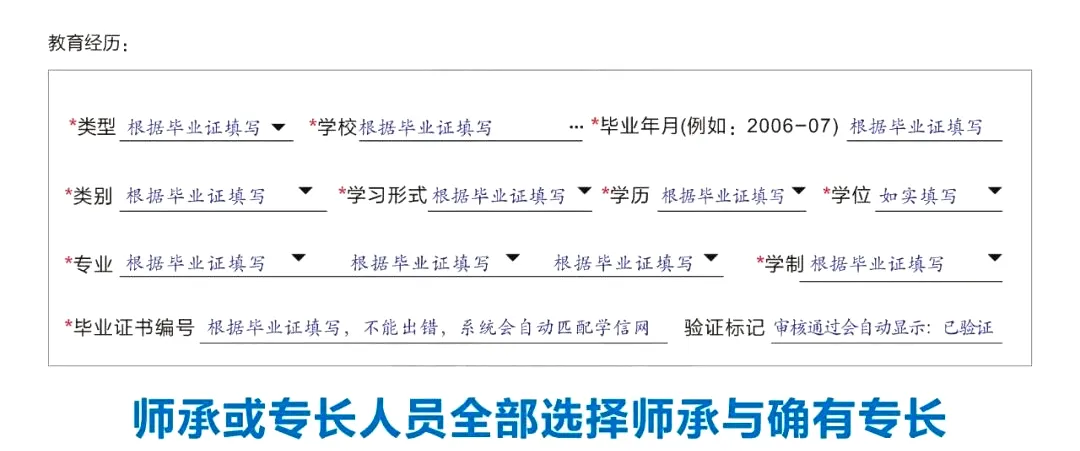 2.师承或专长人员:在学校中选择师承及确有专长,毕业年月及毕业证书编号处都填写“-”即可;