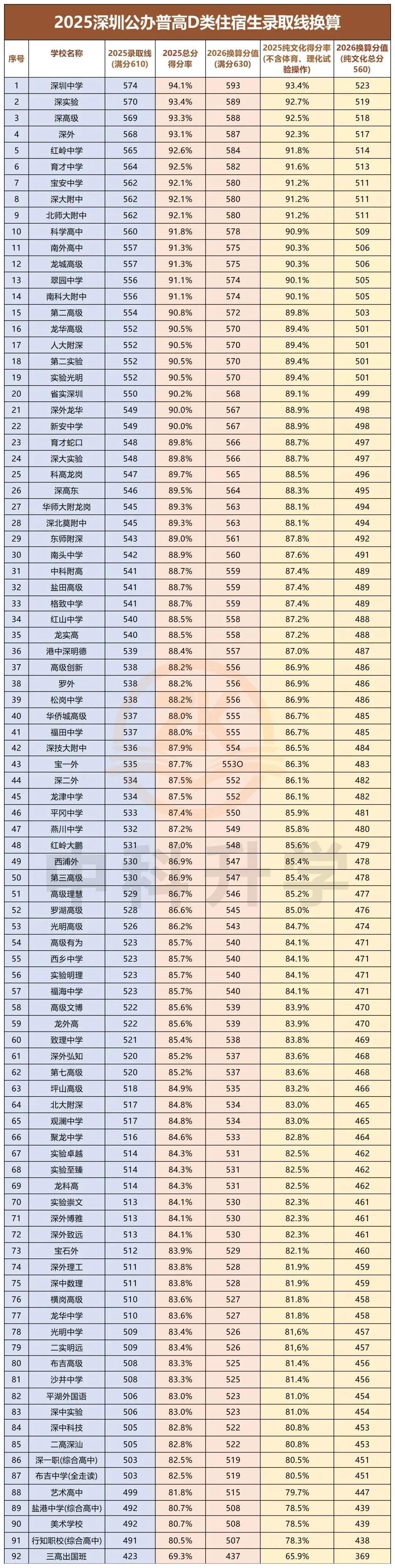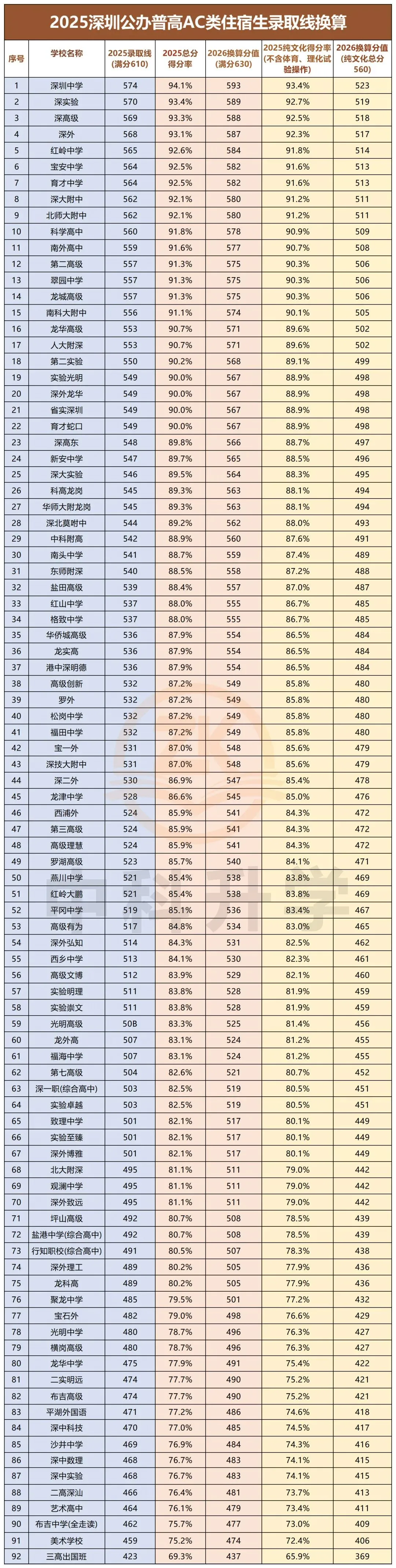 具体可通过以下例子清晰理解换算逻辑:2025 年深圳中考满分 610 分,其中深圳中学 AC 类住宿生录取分数线为 574 分,经计算该分数占当年中考满分的比例约为 574/610≈94.1%,这个比例即为 2025 年深中 AC 类住宿生的中考总分得分率。