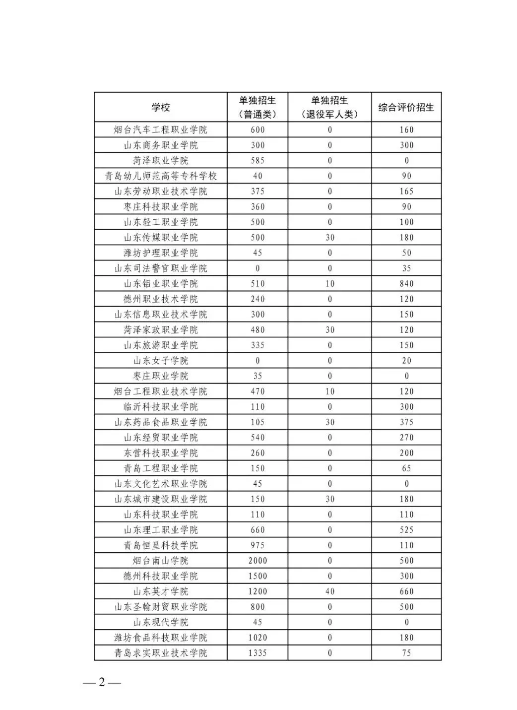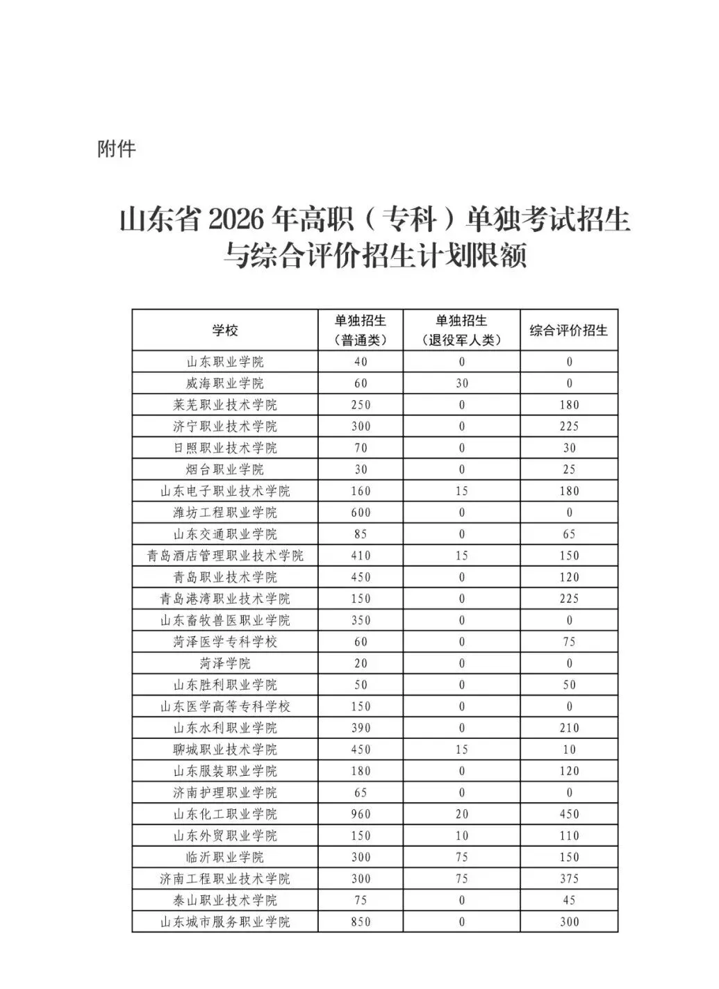 山东省2026年高职(专科)单独考试招生与综合评价招生计划限额