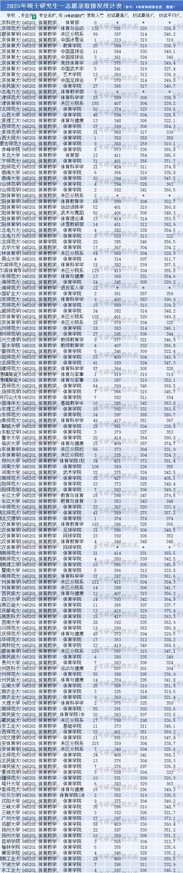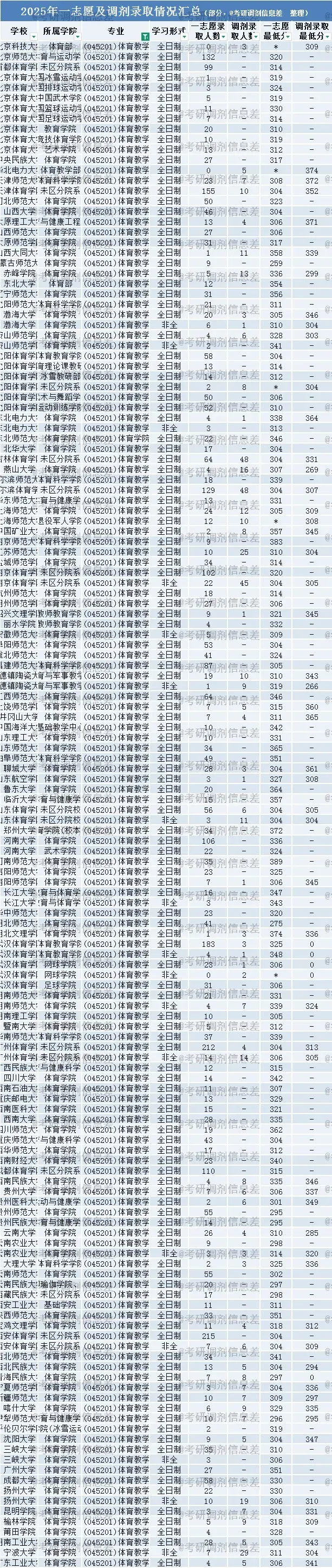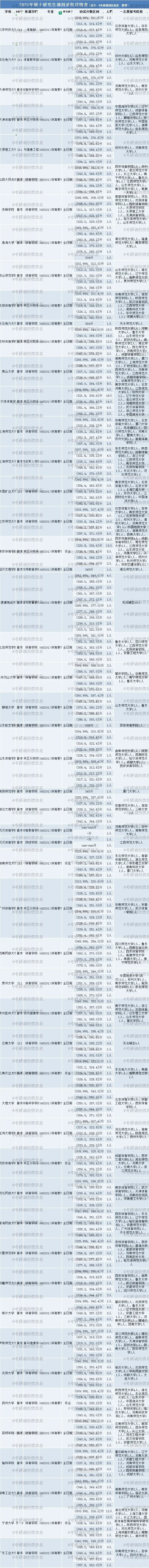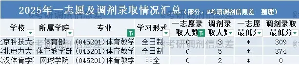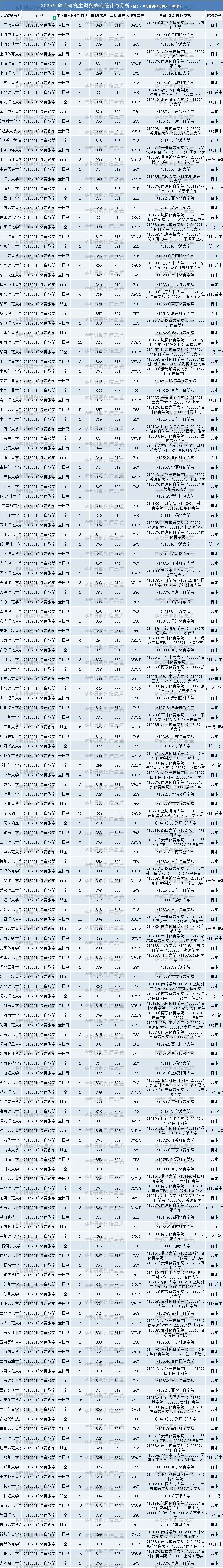 1️⃣ 受2025年考研总人数下降📉50万影响,多数专业一志愿报考人数减少,调剂名额相应增多,教育学-体育教学专业亦不例外。2025年,该专业一共有117所院校招生,其中51所接受考研调剂,共录取调剂生532人。热门院校如西安体育学院,一志愿录取215人,一志愿录取最低分304分,未接收考研调剂。各院校具体录取情况见下图(部分展示),部分院校出现“一志愿录取人数少于考研调剂录取人数”“一志愿最低分高于调剂最低分”:西安体育学院,录取215人,录取最低分304分;