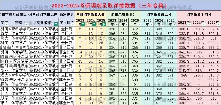 2025年,该专业一共有51个学校接受考研调剂,录取调剂532人。其中考研调剂录取人数最多的学校是吉林体育学院,考研调剂录取48人,录取最低分304分。调剂生源一志愿院校包括陕西师范大学5人,河南大学4人,鲁东大学3人,山东师范大学3人,郑州大学2人,曲阜师范大学2人,湖北师范大学2人,西北师范大学2人,河南师范大学2人,成都体育学院2人,衡阳师范学院1人,江西财经大学1人,广西民族大学1人,四川师范大学1人,中国地质大学(武汉)1人,山东大学1人,沈阳体育学院1人,南宁师范大学1人,长江大学1人,华东交通大学1人,辽宁师范大学1人,广州大学1人,安徽师范大学1人,信阳师范学院1人,西安体育学院1人,南京体育学院1人,首都体育学院1人,哈尔滨师范大学1人,西南交通大学1人,西南大学1人,武汉体育学院1人等。调剂选学校,最重要的就是参考去年接收调剂院校,从“录取量”与“录取分”双维度定位📊调剂录取人数TOP3院校: