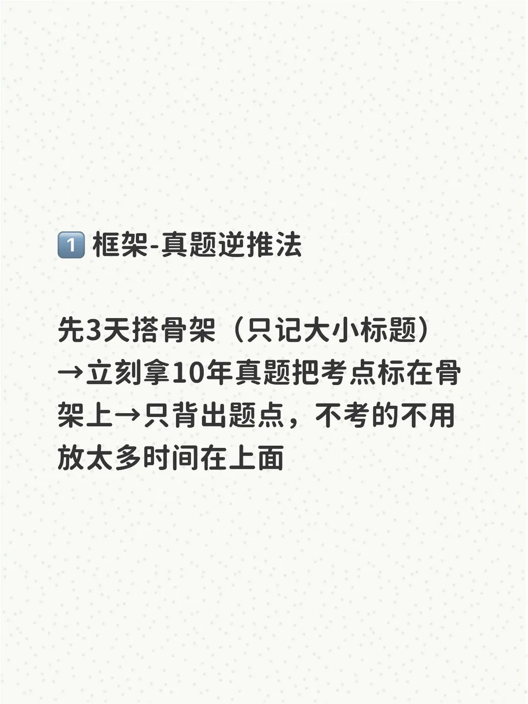 先3天搭骨架(只记大小标题)→立刻拿10年真题把考点标在骨架上→只背出题点,不考的不用放太多时间在上面