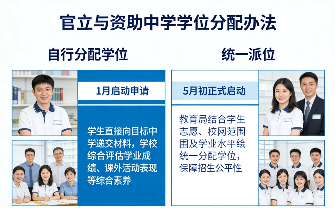 🔹 自行分配学位:每年1月启动申请,学生可直接向目标中学递交材料,学校将综合评估学生的学业成绩、课外活动表现等综合素养。