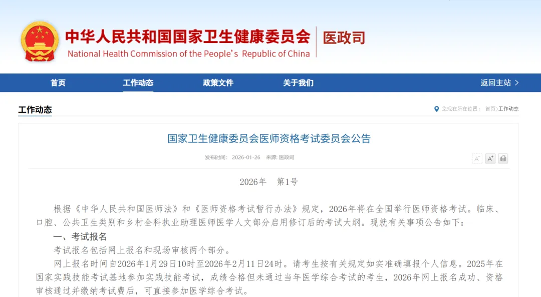 国家卫生健康委员会医师资格考试委员会2026年1月23日