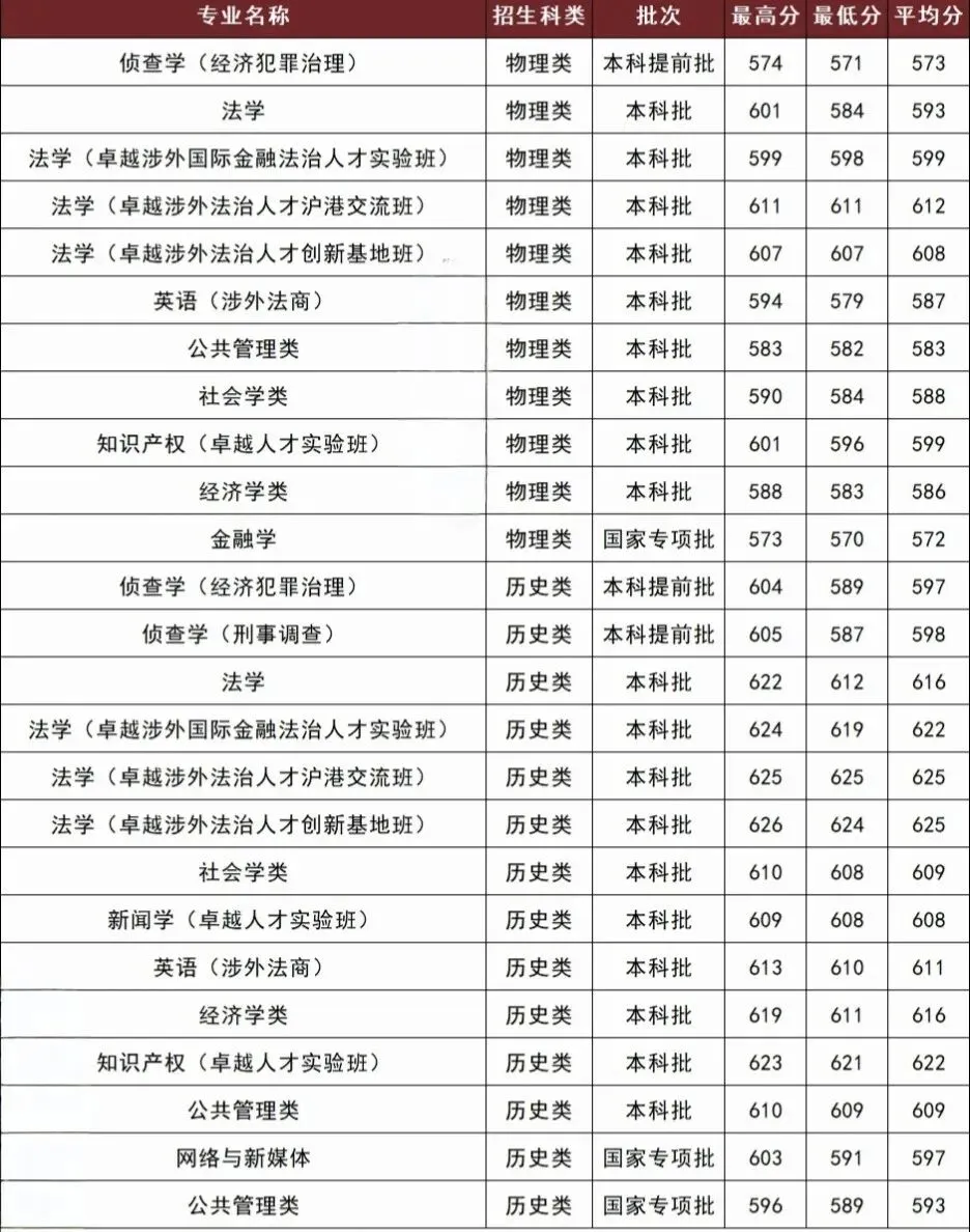 >华东政法大学2025年在江西省各专业录取分数线