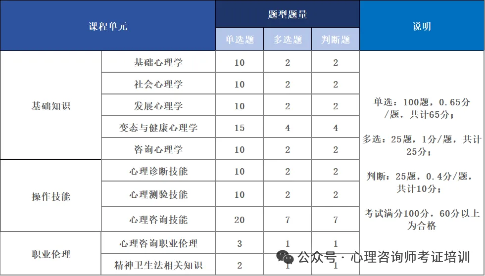 1、理论知识:普通心理学、社会心理学、发展心理学、变态与健康心理学、咨询心理学的基础知识和基本理论等五个科目。