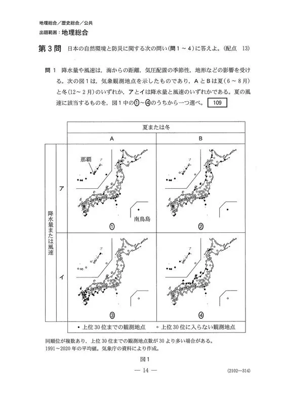 这是一个利用观测数据和地形图考察日本自然环境和灾害风险的大问题。所涉及的资料和内容本身都是关于气象和地形的基本内容,但也出现了将其与灾害时的判断和防灾对策的讨论联系起来的问题。