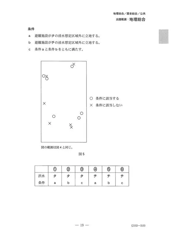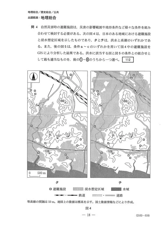 问题4需要将地形图与浸水预想区域、避难设施的位置重合,讨论灾害时避难的适当性。这道题考验的是综合多个条件思考防灾的能力,判断需要一定的时间。