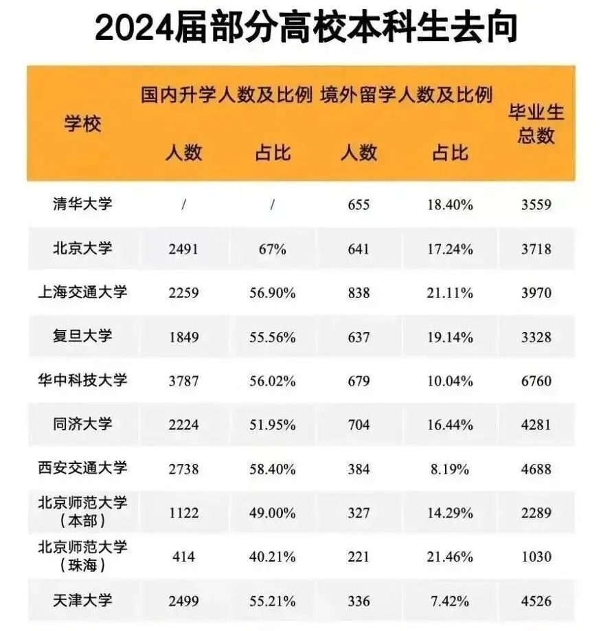通过数据梳理可以发现,绝大部分院校的本科毕业生,有50%以上都选择了国内升学(或保研或考研),留学的比例则多在10%-20%之间。
