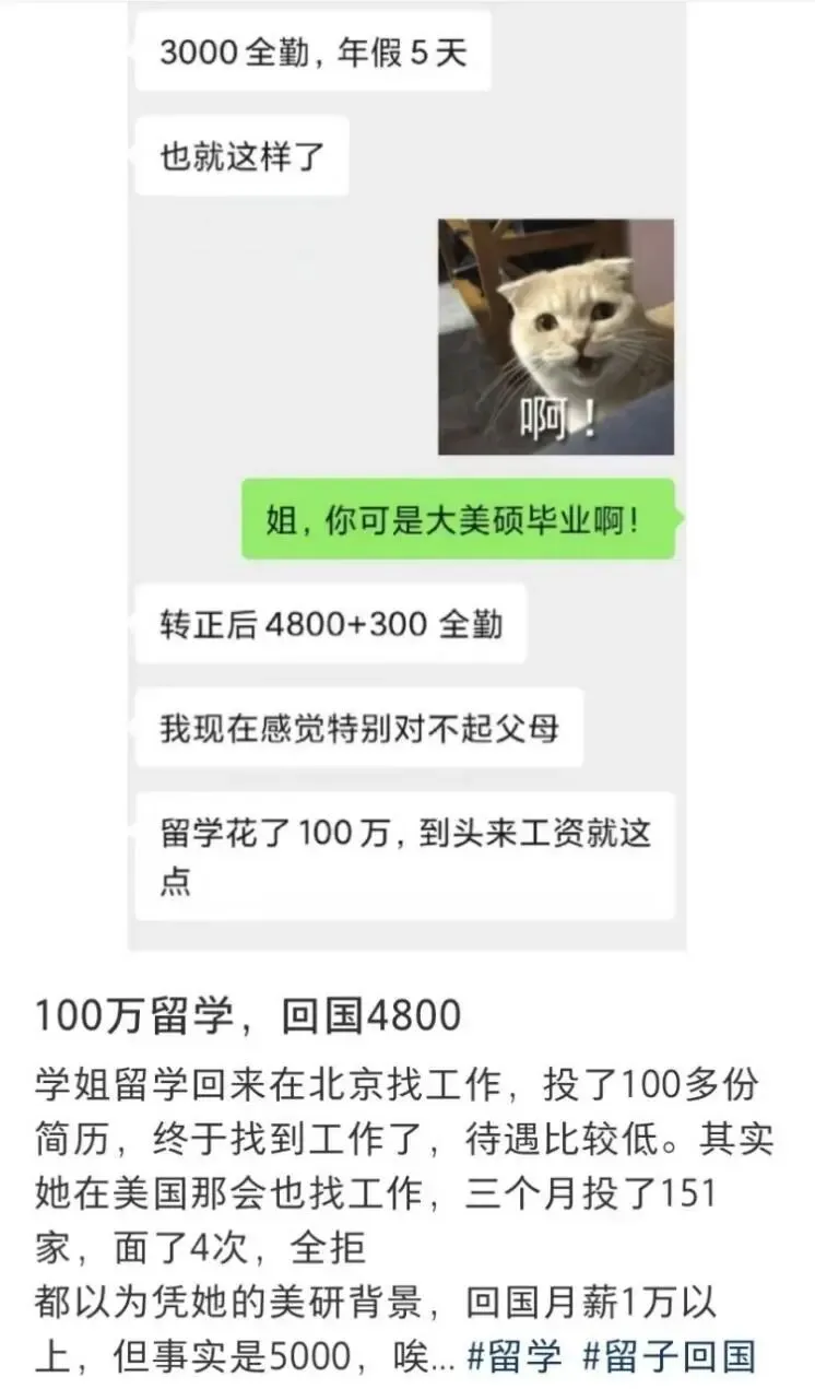 此外,留学生长期身处海外,错过国内秋招黄金期不说,更缺乏本土实习经历,不容易被企业认可,要是没选到QS排名靠前的院校,还不如国内92硕士,甚至会被质疑花钱买文凭,求职时更加被动。
