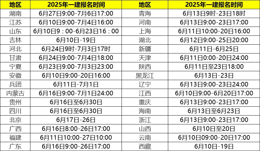 各地2025年一级建造师考试报名时间如下: