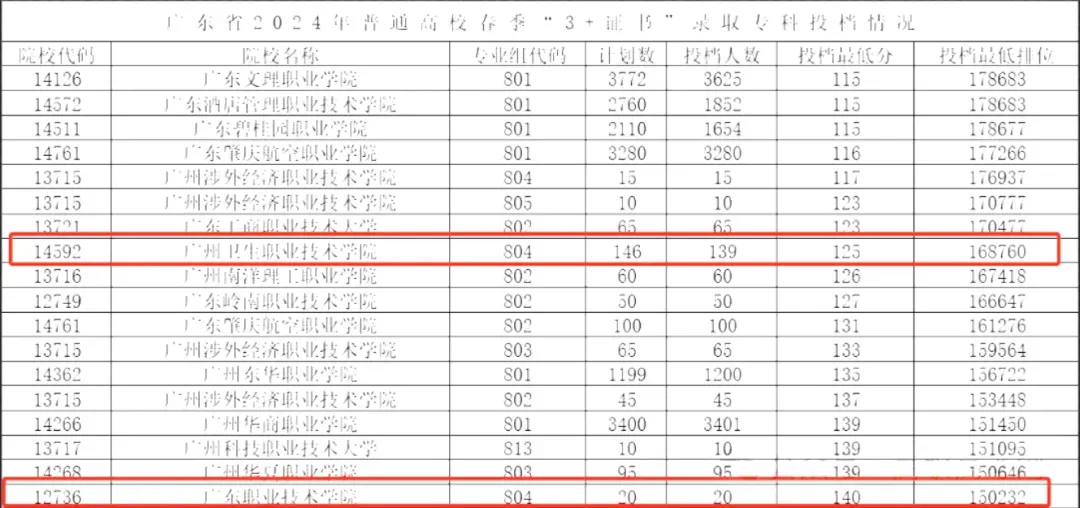 在第一次投档结果出来后,小编整理发现有一个公办院校专业组的最低分分数线是125分,广州卫生职业技术学院。同学以125分成功捡漏公办院校!运气非常好。