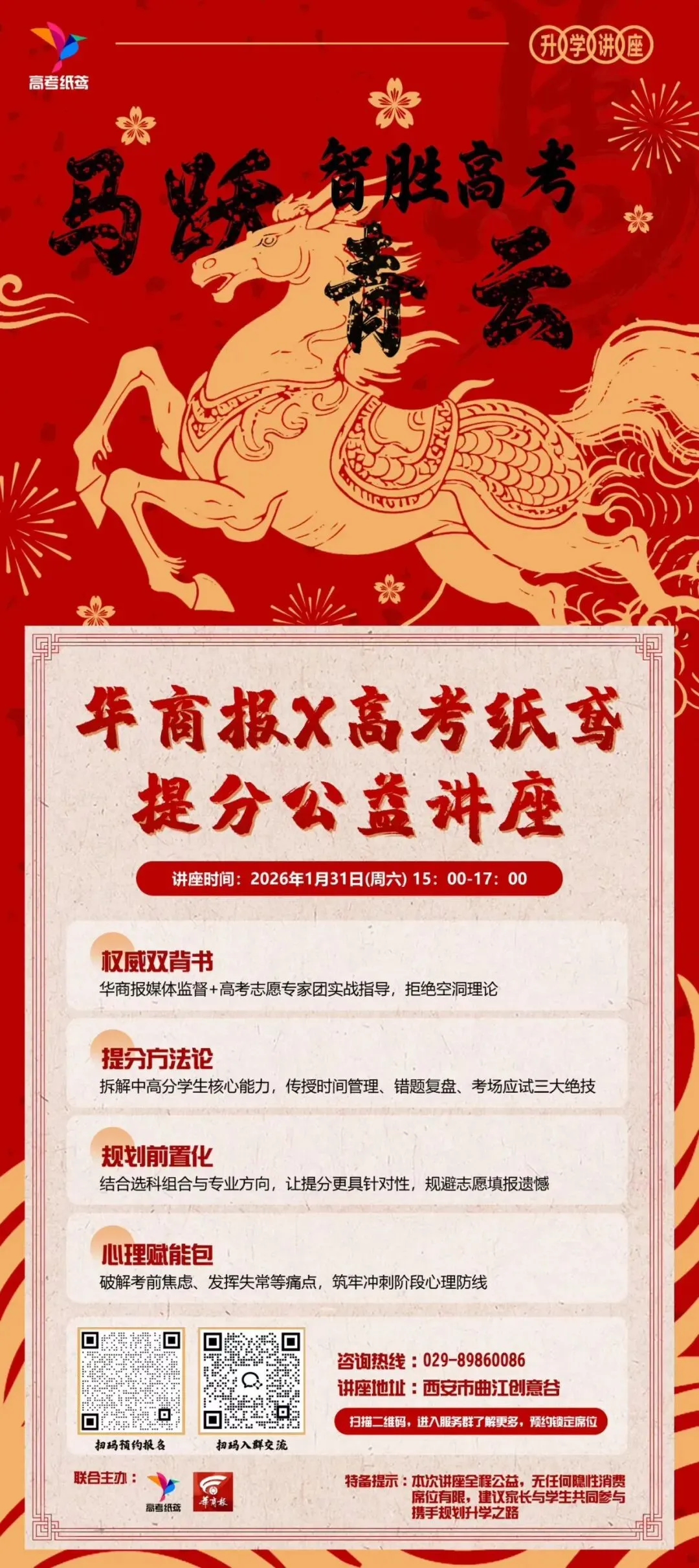 随着陕西一模考试成绩陆续公布,不少高三学子正面临提分乏力、方向迷茫的困境:错题反复出现却找不到根源,时间分配不合理导致效率低下,选科与专业衔接不明晰,甚至因成绩波动陷入焦虑情绪。为切实解决考生和家长的核心困惑,华商报作为陕西本土权威媒体,特邀深耕高考升学领域的纸鸢教育实战派专家团,联合推出——“马跃青云·智胜高考”提分公益讲座