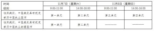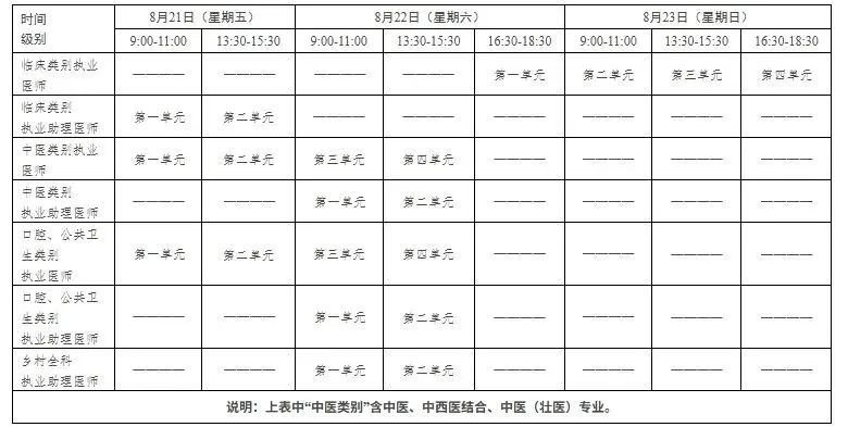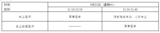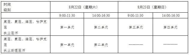 考试实行计算机化考试,军队现役人员、文职人员加试军事医学,院前急救岗位和儿科专业加试相应内容。中医类别藏医、蒙医、维医、哈萨克医专业实行纸笔考试。统一考试时间如下: