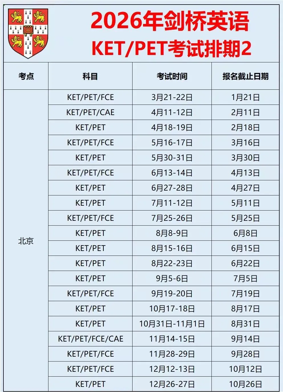 家有学子备战剑桥英语KET/PET/FCE的北京家长们注意了!2026年北京地区KET/PET/FCE全年考试安排已正式发布。