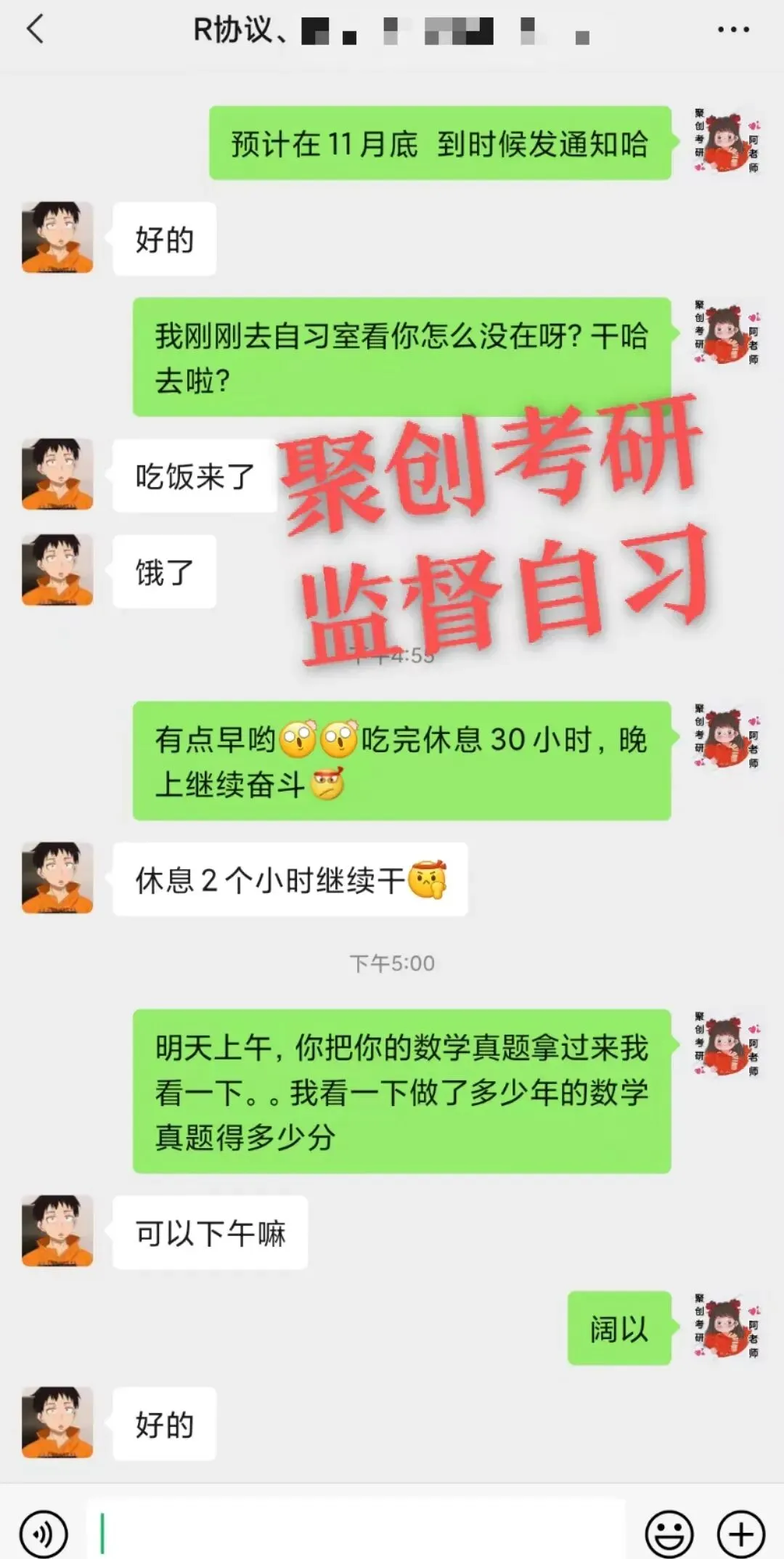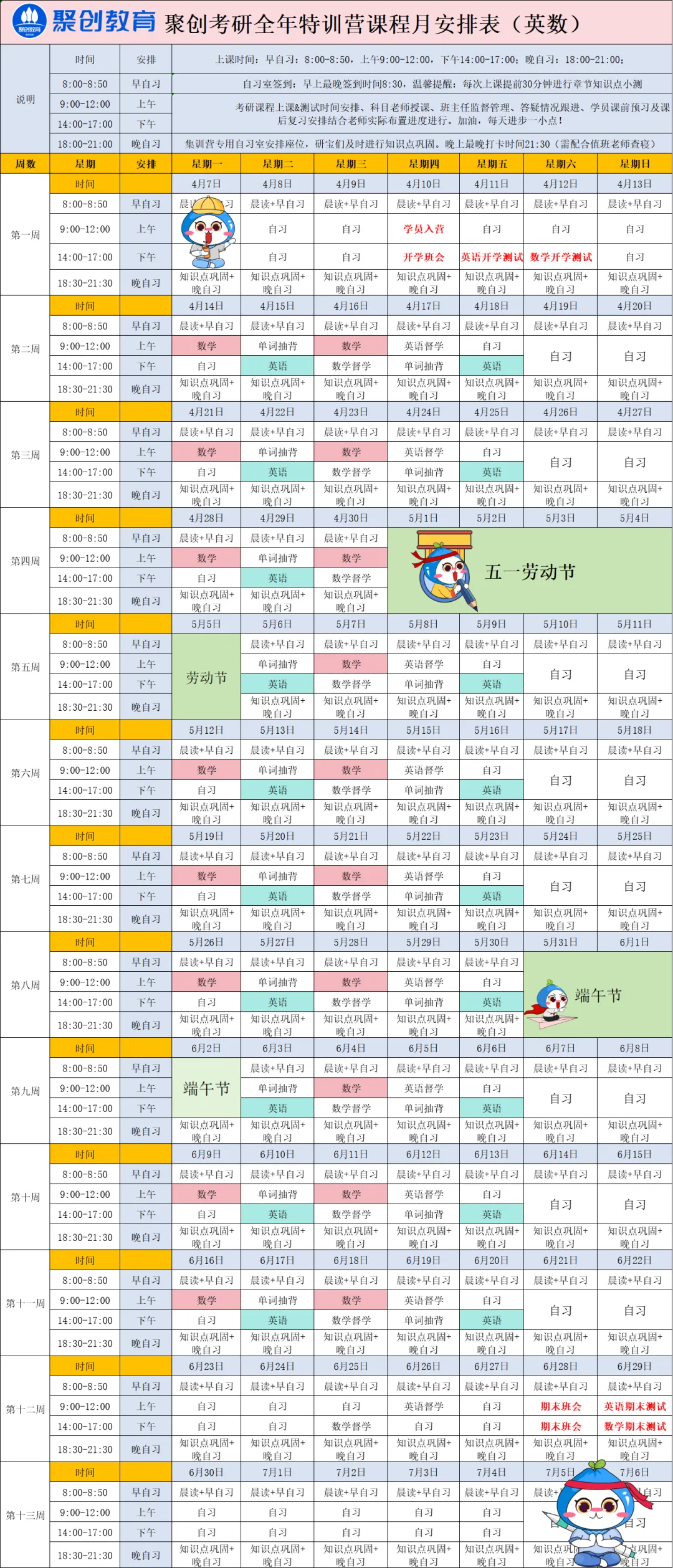 选择好的辅导资料等于成功了一半。我们全程为大家分阶段提供市面优质的辅导书籍和聚创考研内部高端教辅资料。比如英语词汇、英语真题讲义、数学习题集、典型重点题集、真题集、考试分析手册等等。聚创考研集训营每天都有紧密的课程安排,早自习+上课+测评+练习+答疑...,备考细化到分秒必争,24小时标准化作息,全身心投入,每天都是高效的复习和提升状态。