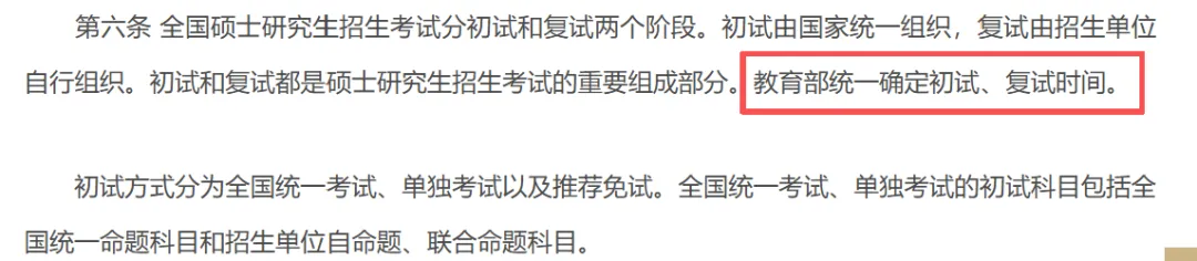 原文要点:今年的规定中明确 “教育部统一确定初试、复试时间” ,复试时间的决定权更加上移。