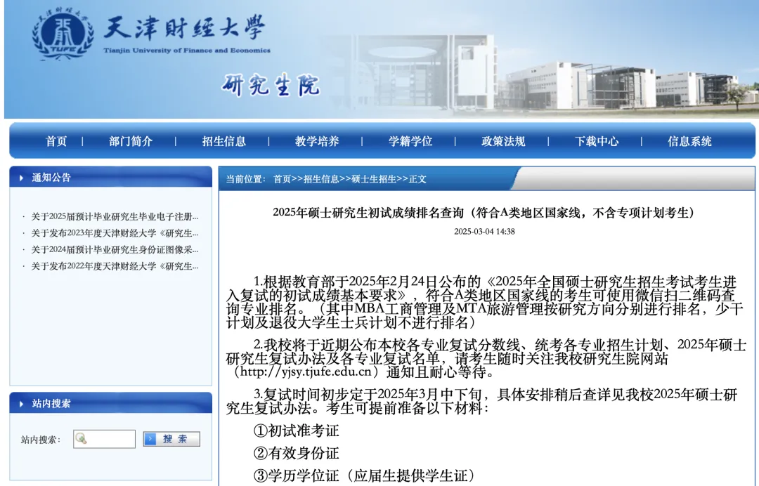 天津财经大学公布初试成绩排名查询信息,并公布各专业复试线、复试办法及复试名单。