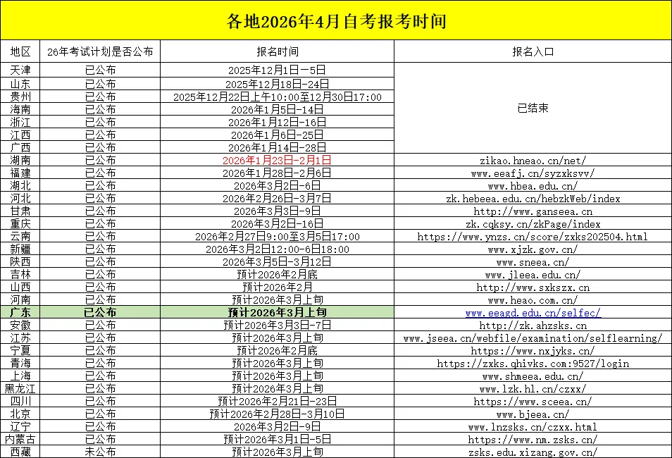 1、计划参加4月份自考笔试的考生正式报名全部网上进行,首次参加自学考试学生(即没有广东省自考准考证的考生)需完成新生报名手续,获取准考证后才可选择课程报考参加考试!报名报考安排详见考试院通知:https://mp.weixin.qq.com/s/d6aQ8ONd5bAC7Kklkjn5YQ?scene=1