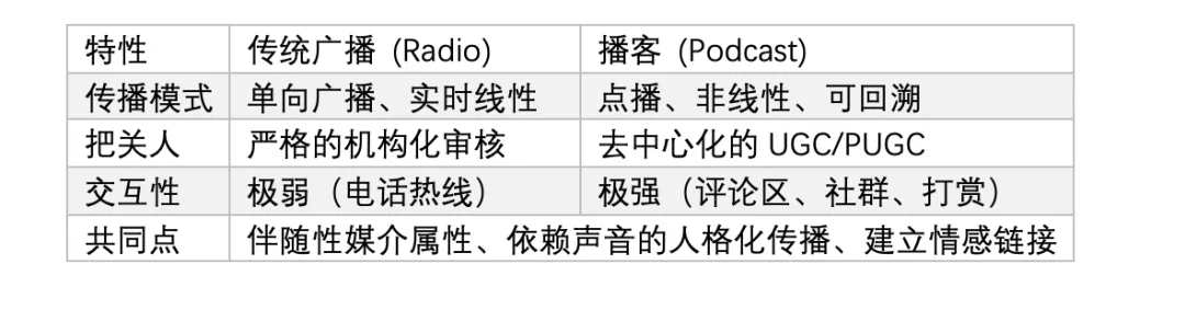 而对于播客与传统广播的异同,我们则可从以下几个方面来论述。
