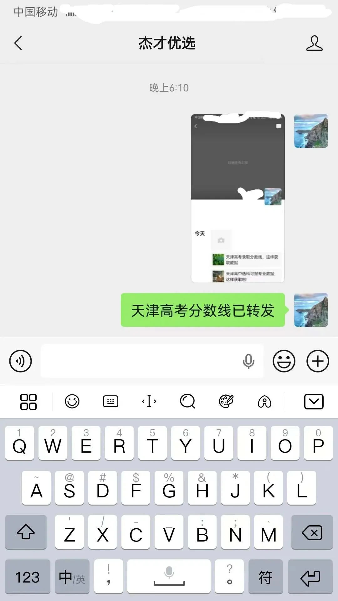 3.把已转发的截屏和下面引号中的文字“天津高考分数线已转发”发到公众号后台,等待审核(飞速审核)