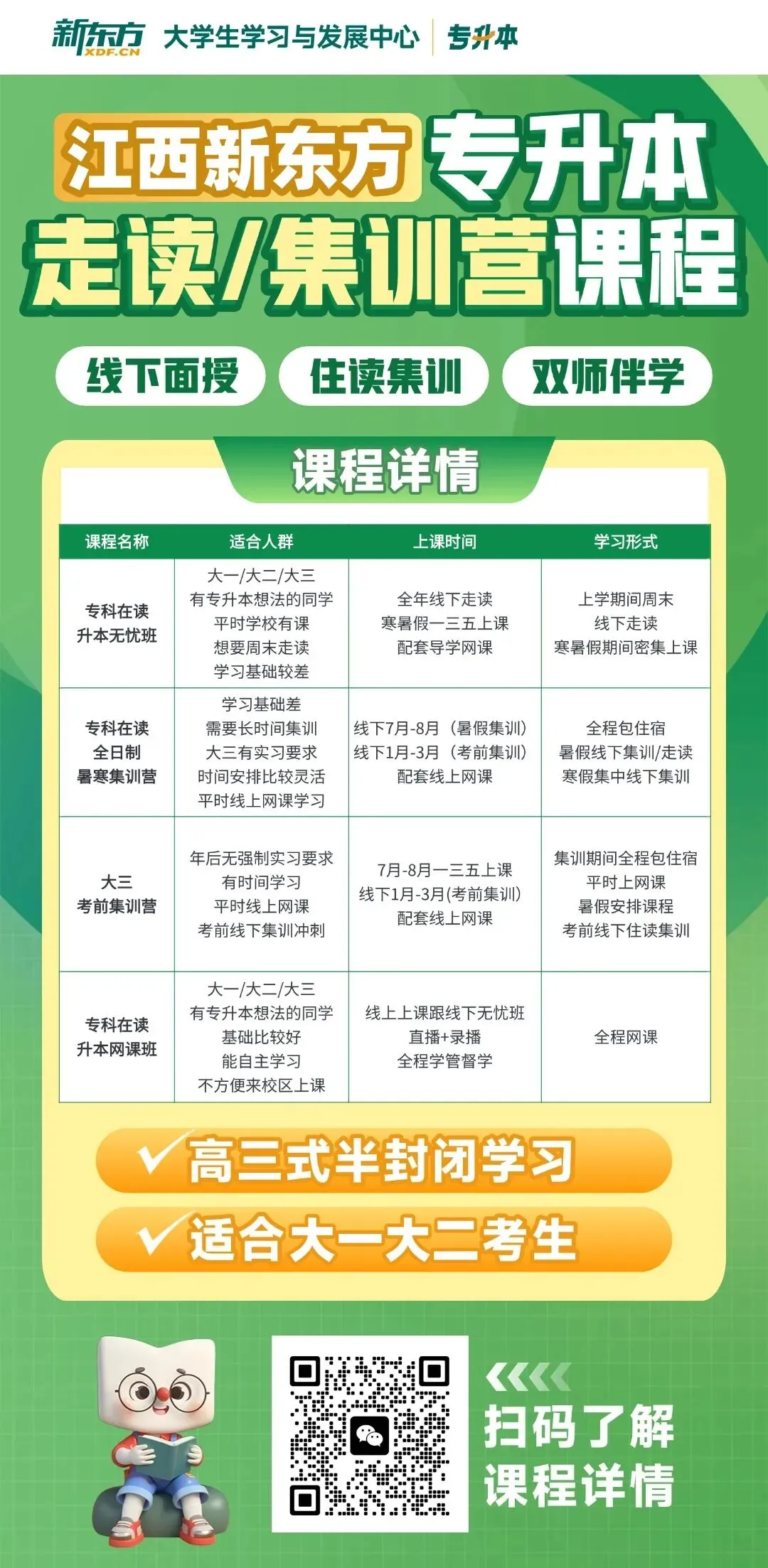 江西新东方专升本课程:线上网课、线下集训营及走读课程等,✨分阶制定、学至考前、全程跟进,如需了解更多课程类型和课程详情,可以下滑查看、扫码咨询