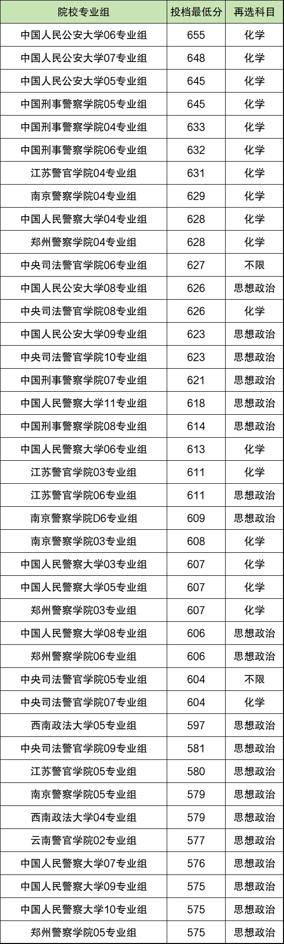 其余院校专业组分数线为:中国刑事警察学院05专业组645分、江苏警官学院04专业组631分、南京警察学院04专业组629分等。
