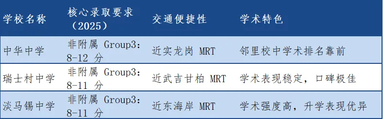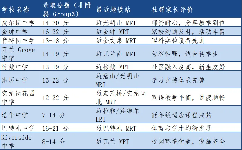 基督堂中学:推行 “4+1” timetable,周一周四专攻学术,周五全时段开展 CCA(课外辅助活动),非附属 Group3 分 12-17 分,近兀兰南 MRT,且与圣安德烈初级学院有衔接优势。