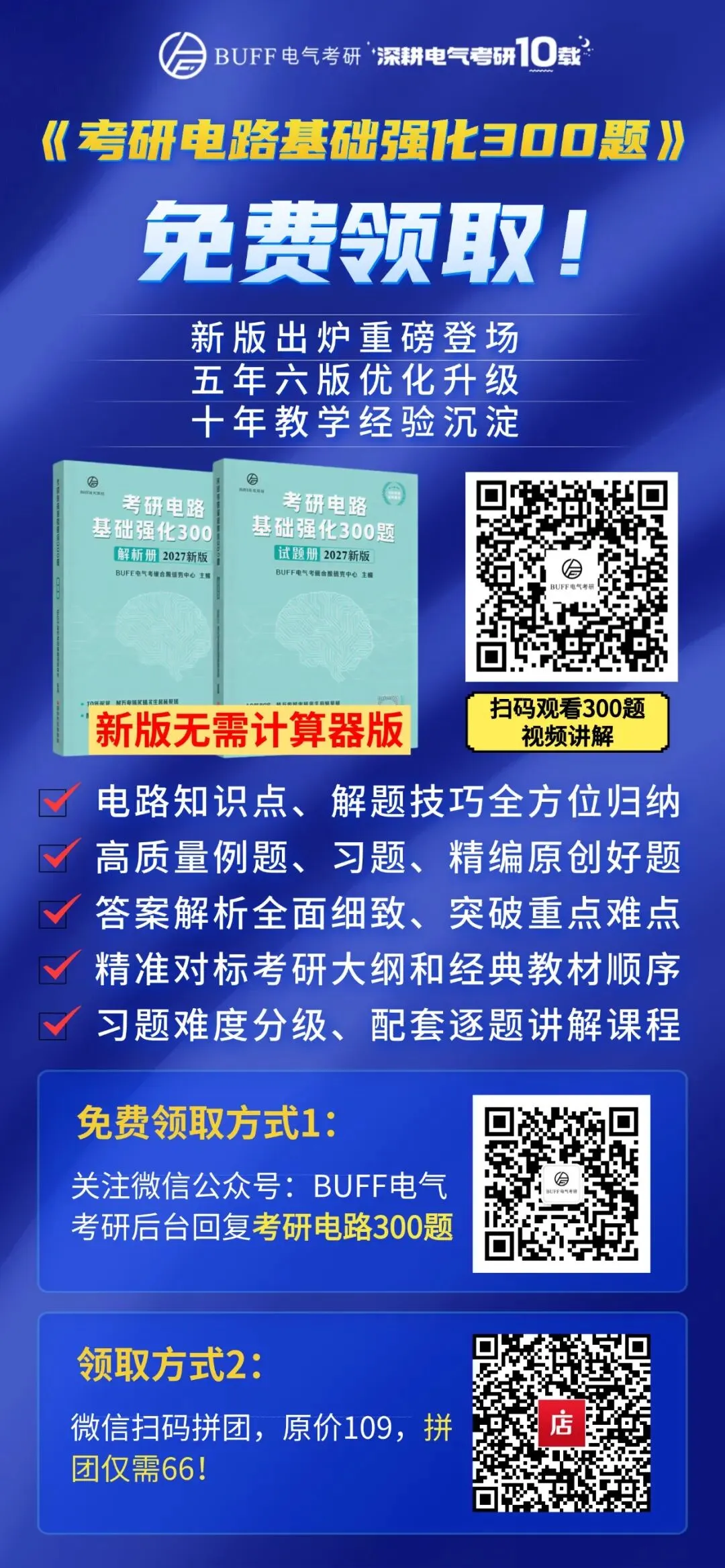 5年前,BUFF电气考研电路教研组根据多年教学经验,精心编写了《考研电路基础强化300题》第一版。之后,BUFF团队每年定期更新,截至目前已超10万考研学子使用该资料备考学习电路。