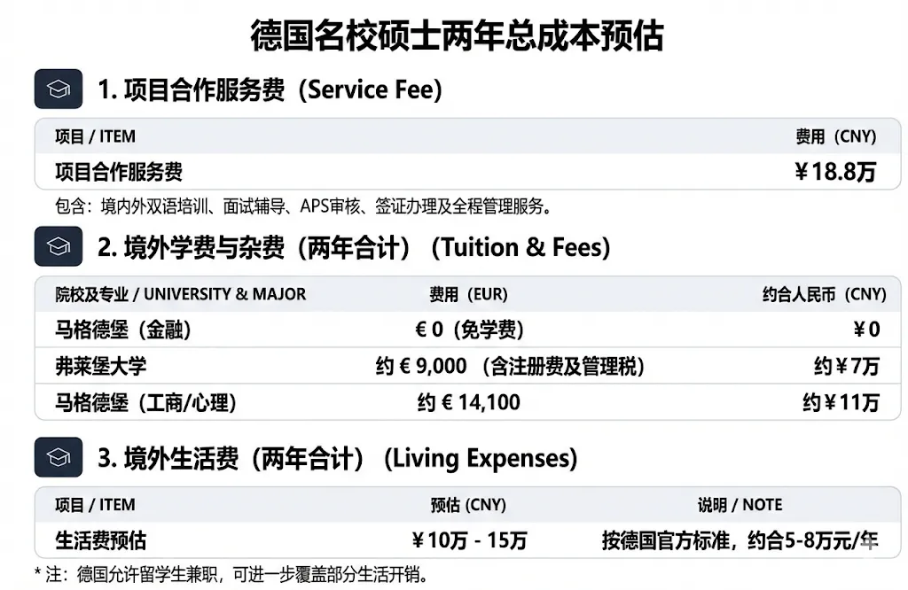 生活成本对比:相比英美国家动辄50万人民币/年的开销,德国留学两年总成本(含生活费)20-25万人民币。