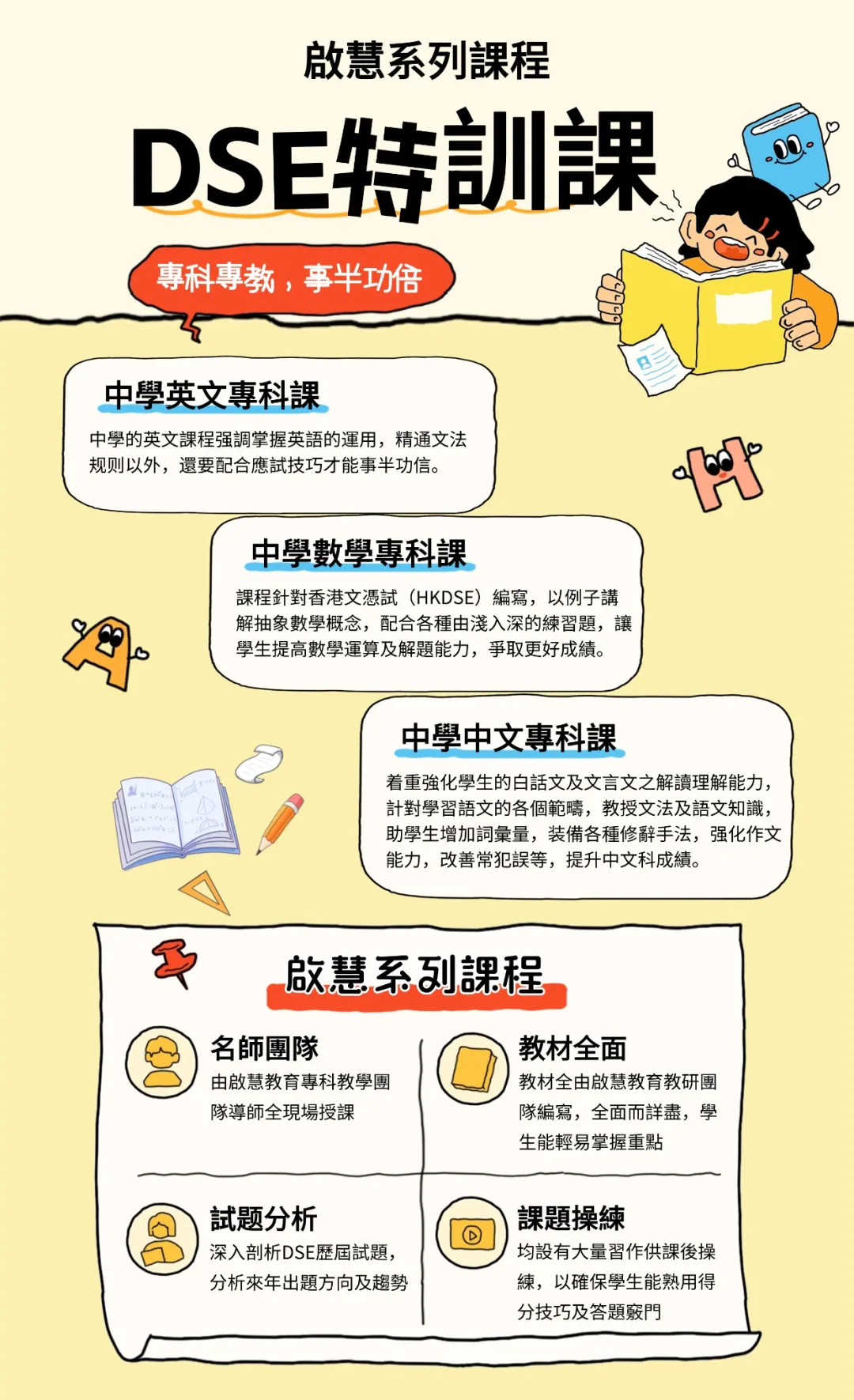 •着重强化学生的白话文及文言文的解读理解能力,针对学习语文的各个范畴,教授文法及语文知识,帮助学生增加词汇量,掌握各种修辞手法,强化作文能力,改善常犯错误等,提升中文科成绩。