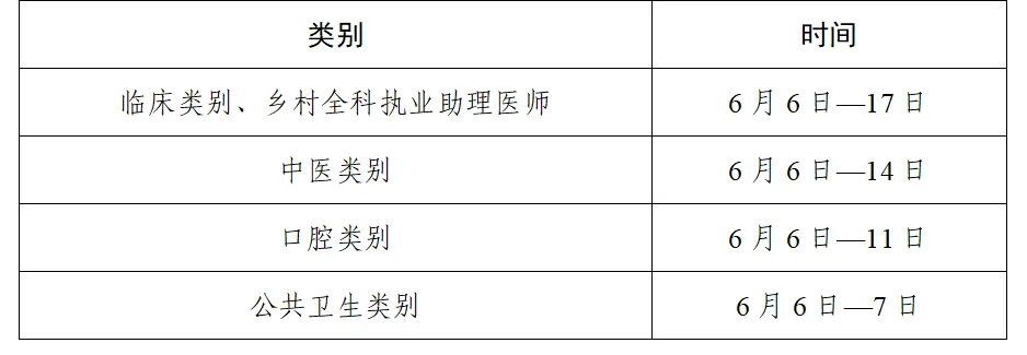 考试实行计算机化考试,军队现役人员、文职人员加试军事医学,院前急救岗位和儿科专业加试相应内容。中医类别藏医、蒙医、维医、哈萨克医专业实行纸笔考试。统一考试时间如下: