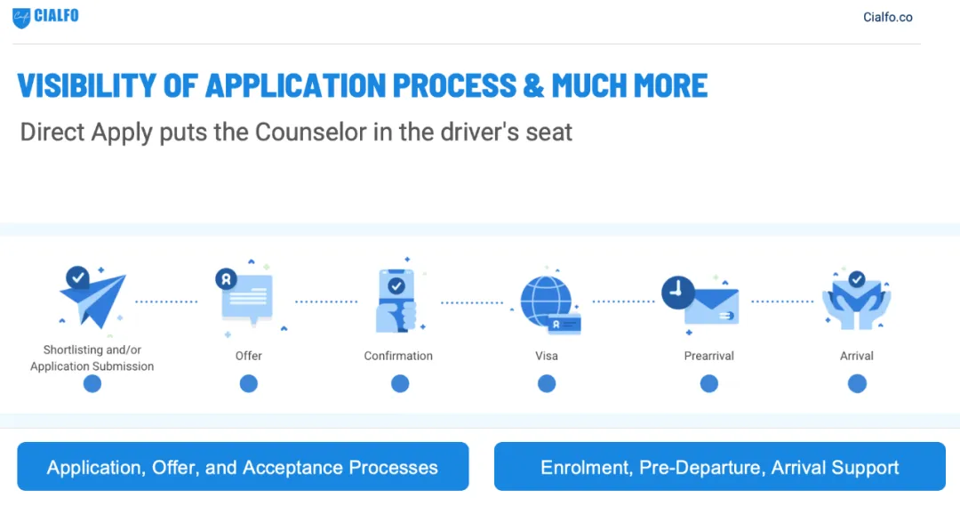 升学指导老师也可以通过Cialfo平台完成学生英国大学申请表的检核、补充材料(预估分、推荐信)递送、申请状态追踪、接受/选择offer、以及整体申请数据的管理和分析。作为升学指导老师的好帮手,「Direct Apply」以及我们的团队老师将为您带来“从学生选校至前往海外大学就读”完整的科技化解决方案和专业服务。