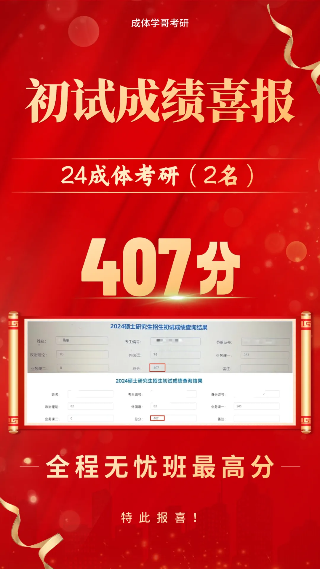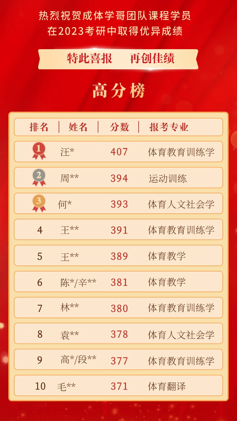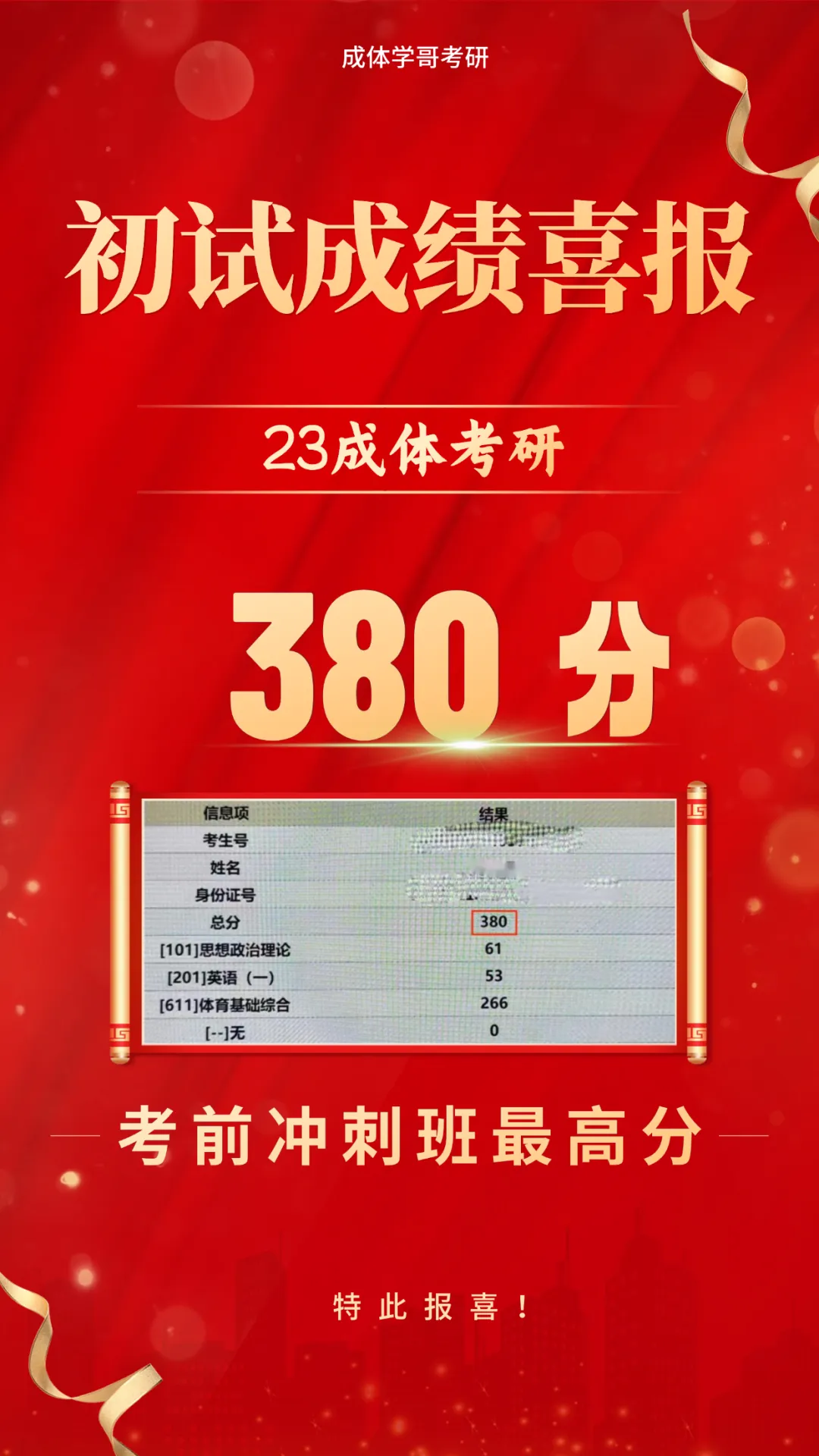 2、根据成体学哥团队的内部统计,全程班学员整体录取比例约为60%,譬如2025年最高分397分,2024年最高分407分,2023年最高分407分,2022年最高分408分,2021年最高分398分,最低分283分都为成体学哥团队全程班学员,同样的课程分数差距之大,同时近几年成都体育学院考研试题更为灵活多变,因此考研上岸是有多种影响因素的,我们并不能做到百分之百的上岸率;