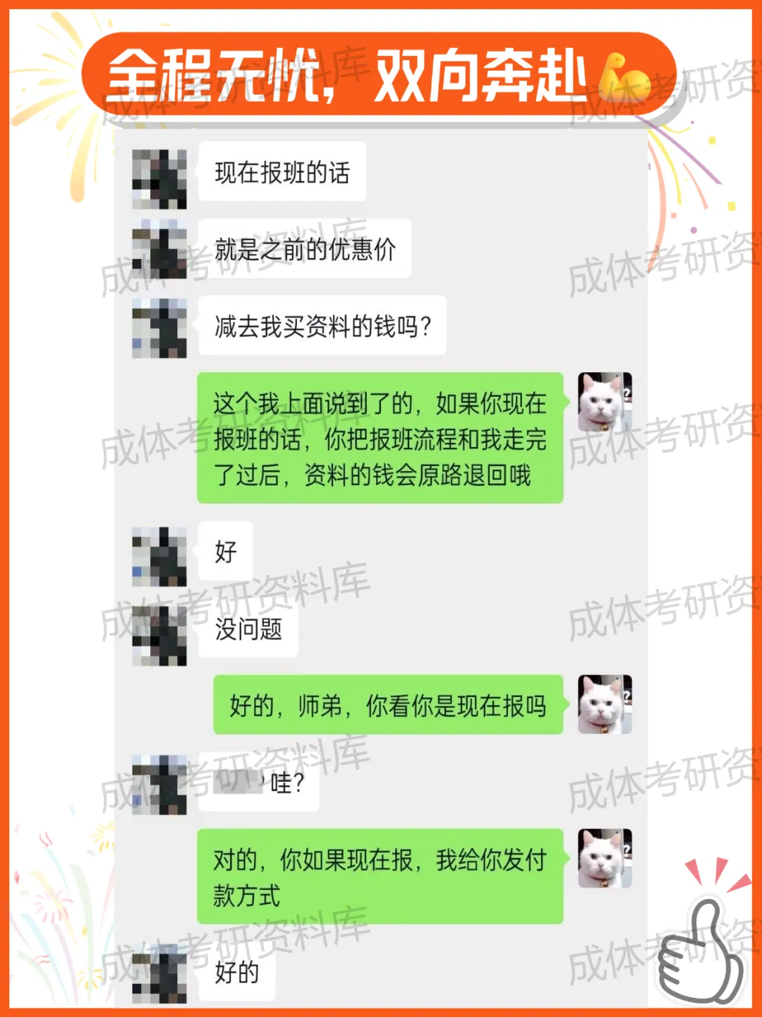 3、考研这一年中,总会有许多学弟学妹陆陆续续因为各种原因弃考,但成年人应该为自己的选择“买单”,所以希望你是一个有契约精神的人。如果没有下定决心考研,可以先不要报名付款,因为每年都有一时冲动的学弟学妹,什么都没了解,就直接付款报名,课程系统登记录入以后,然后过几天又后悔,找我们申请退款,所以希望大家理性一点,报名之前一定要添加客服微信详细咨询并看清【退款说明】:因网络直播/录播课程的特殊性,不支持诸如:因放弃考研或更换目标院校等个人主观原因申请退款;