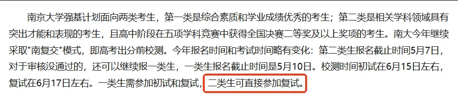 例如,南京大学2025年强基计划规定:第二类考生(高中阶段获五大学科竞赛全国决赛二等奖及以上的破格生)可不参加初试,直接进入复试。