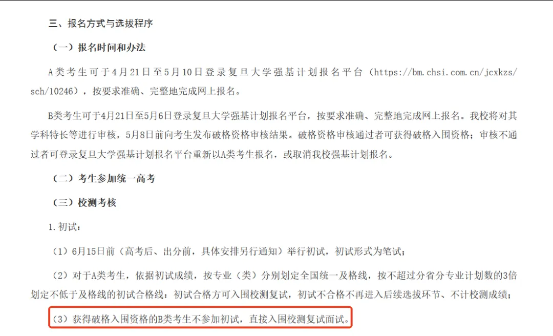 复旦大学2025年强基计划规定:获得破格入围资格的B类考生不参加初试,直接入围校测复试面试。