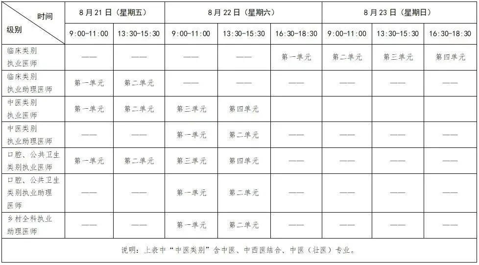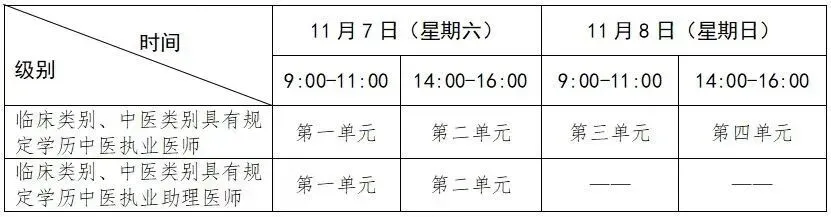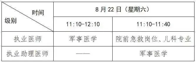 考试实行计算机化考试,军队现役人员、文职人员加试军事医学,院前急救岗位和儿科专业加试相应内容。统一考试时间如下: