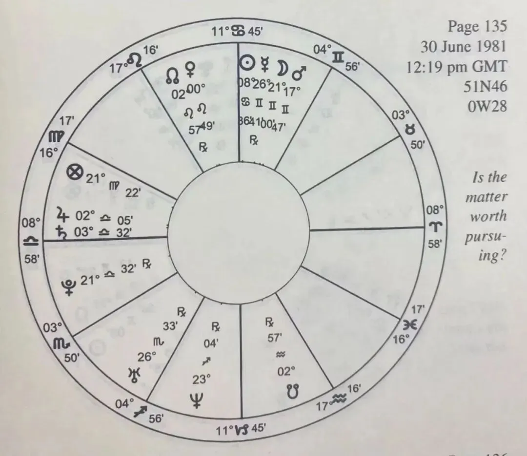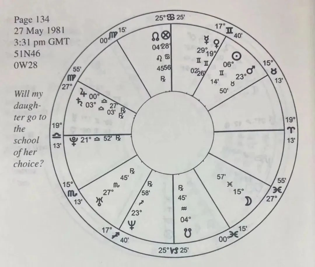 一位焦虑的母亲得知女儿没有被她申请的中学录取, 心情很不好, 就准备找教育当局提出诉求。她问Appleby, "我女儿(最终)能上她选择的中学吗?"月亮落在了第5宫, 子女宫, 妈妈在操心孩子的事情。第5宫宫头双鱼座, 女儿的首选指示行星是木星, 木星在天秤座0度多逆行, 而且在占卜盘的第12宫里, 紧挨着逆行的土星, 很弱, 很无力。月亮既可以是母亲、也可是是孩子的天然指示行星, 落在第5宫的月亮也就更适合代表孩子了。女儿的第3宫是占卜盘的第7宫, 指示行星是金牛座火星, 她的第9宫是占卜盘第1宫, 主宰行星是双子座金星。双子座天然与教育有关, 金星又落在占卜盘第9宫里, 可见金星最适合作为学业的指示行星。