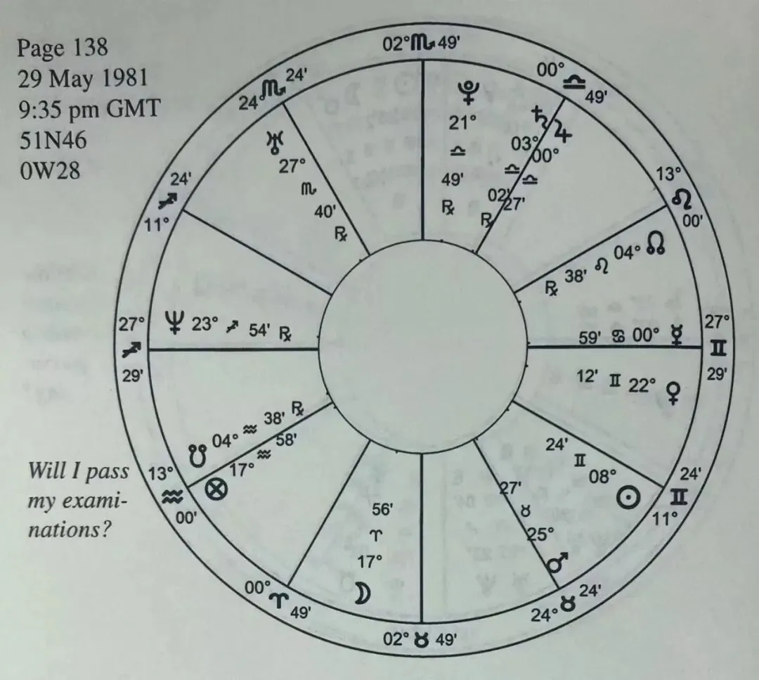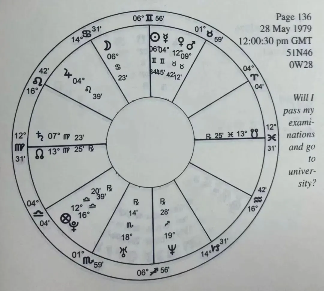 一位男学生参加了大学入学考试, 在等待结果。在焦虑中, 他问“我能通过考试、被大学录取吗?”土星接近上升位置, 事主的首选指示行星水星被太阳灼伤, 不够自信。第9宫的主宰行星是金星。第5宫也与考试有关, 主宰行星是土星。水星和金星不会形成和谐相位;假如算上30度相位的话, 水星和金星会形成相位, 可是双方没有相互接受关系, 而且水星先要经过与土星的刑相。从这里看来希望渺茫。换月亮来指示事主。月亮接下来先后六分土星和金星, 而且月亮和金星都有特别好的尊贵值。这样看来, 升大学又是有希望的。