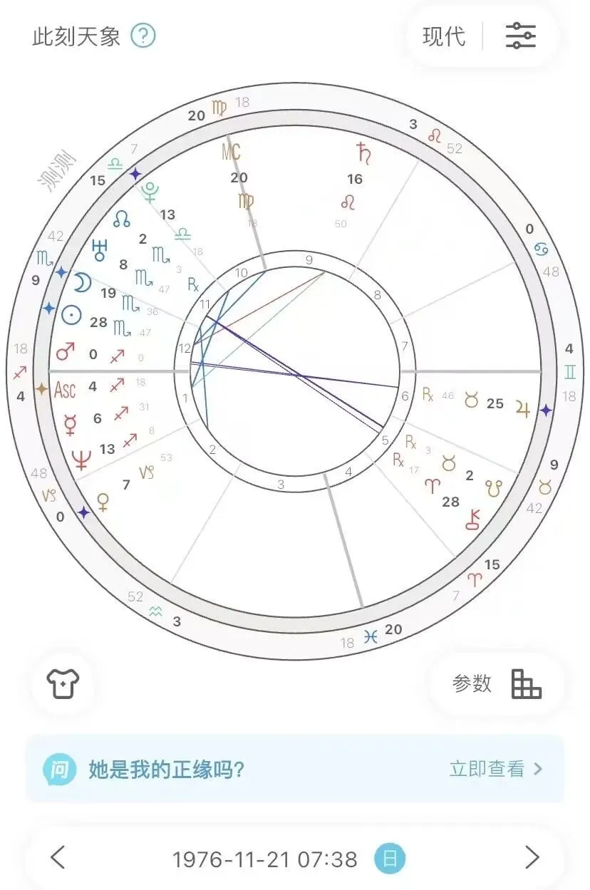 上升位置在焚烧之路上, 宫头附近是逆行的冥王星, 危机和无力的象征。唯一的亮色是金星与上升三合, 可是冥王星是一团浓稠的阴云。