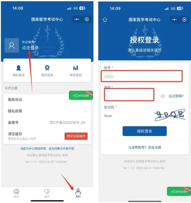 第二步:使用考生服务系统的注册帐号和密码进行小程序授权登陆(已完成考生服务系统与微信绑定的可直接登陆微信小程序),如下图演示: