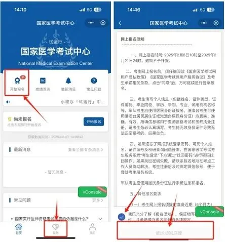 第一步:登陆成功之后可点击「开始报名」或者直接点击下方菜单中的「服务」, 阅读报名须知并勾选后方可进行下一步报名